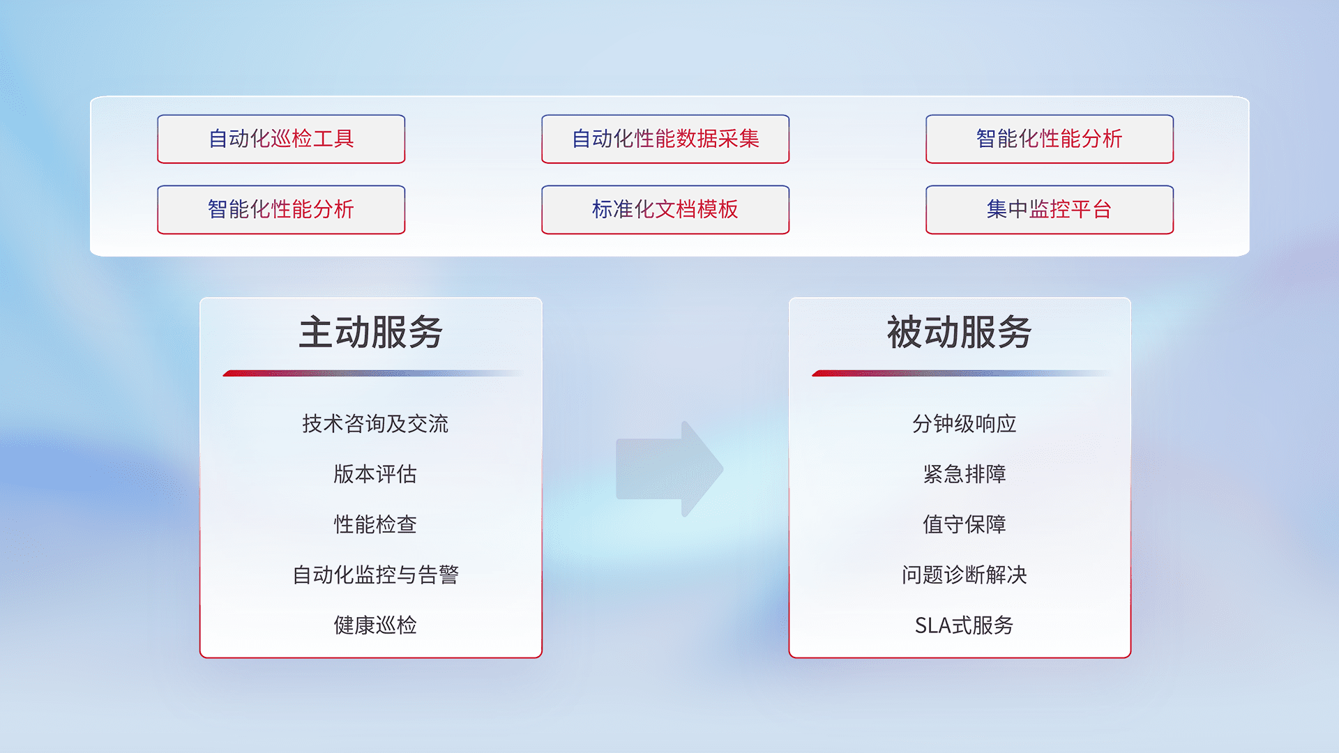 智能化工具和标准化文档,,保障服务质量,,,提供主动服务(包含技术咨询、、、、版本评估、、、性能检查、、、、自动化监控与告警、、、、健康巡检)和被动服务包含(分钟级响应、、、、紧急排障、、、值守保障、、问题诊断解决、、SLA服务)。。。。