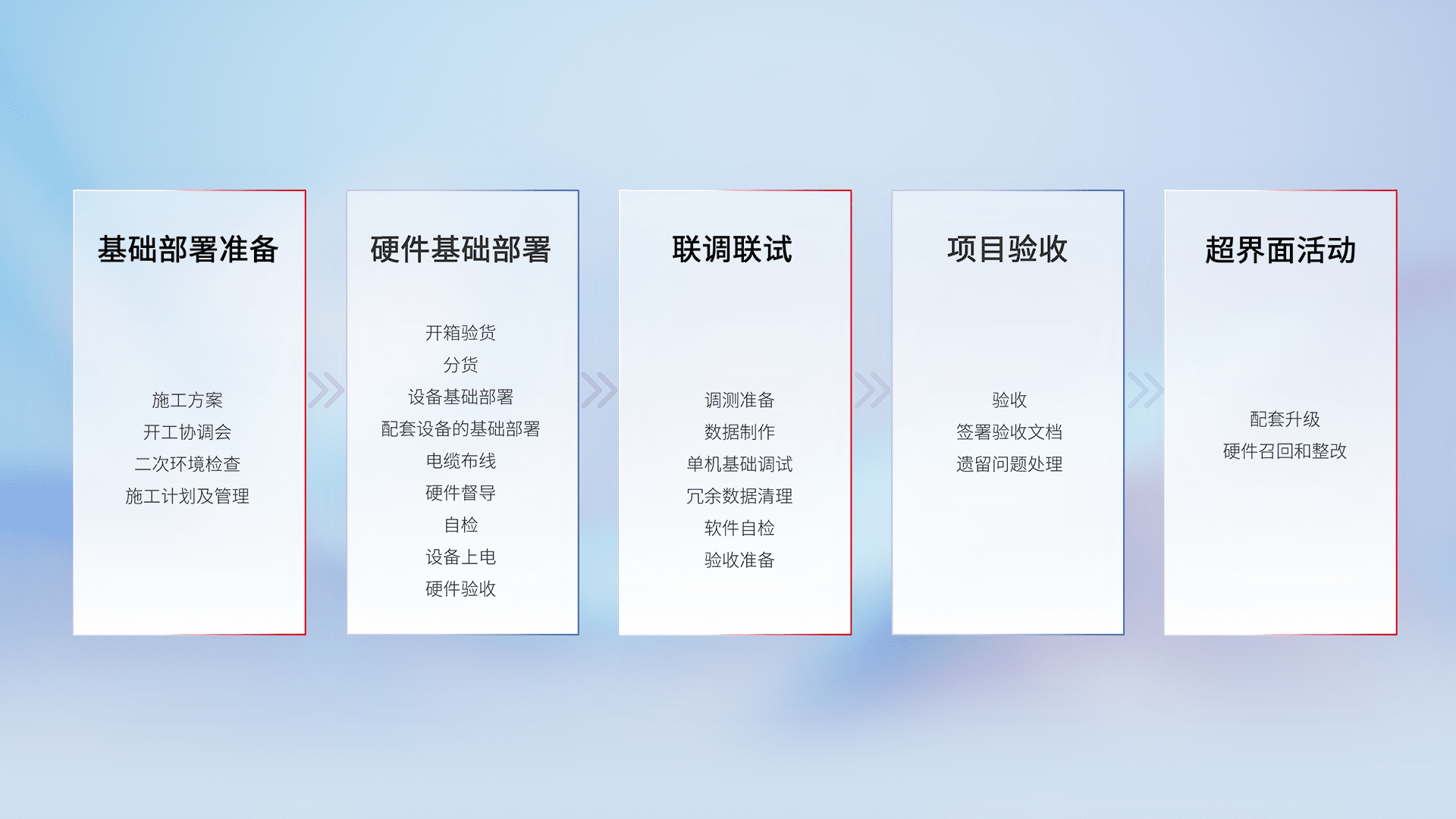 从基础部署准备、、、、硬件基础部署、、、联调联试、、项目验收、、越界面活动的全过程可追溯,,保证施工质量和进度。。。